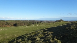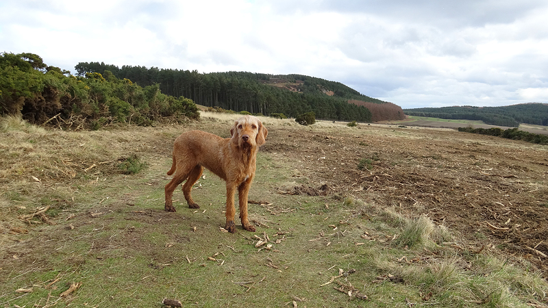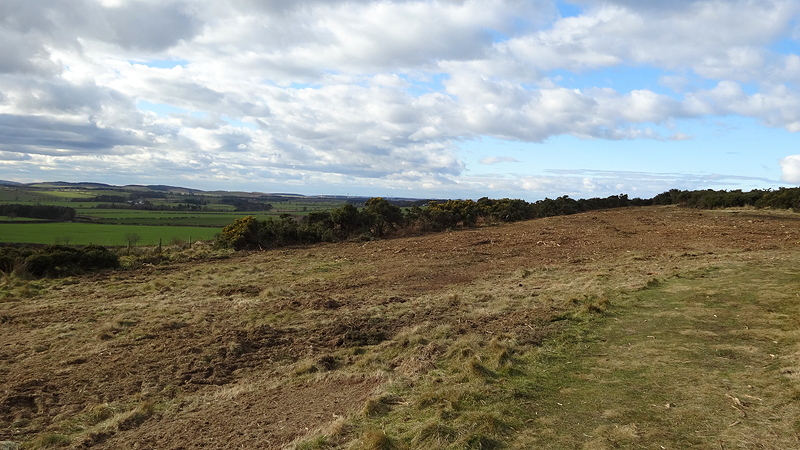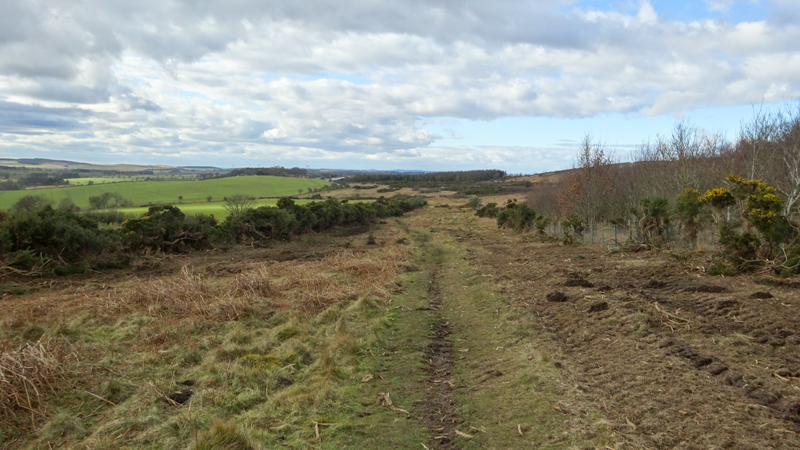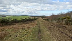 Maar dan ineens ben ik uit het bos en loop ik op een pad met prachtig uitzicht. Wat jammer dat het niet helderder is voor de fotos. Ik kan toch vrij ver kijken. Maar de weg loopt nog altijd naar boven en ik ben benieuwd naar Ros Castle settlement. Volgens mij is dat bovenop dat hompje dat ik voor me zie liggen als ik zo eens op de kaart tuur.
