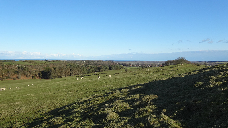 Maar het pad gaat niet naar het topje maar slingert er rechts omheen. Het is wel erg mooi maar waar is dat Ros castle nou? Inmiddels weet ik dat je er alleen via de andere kant kunt komen en dat het een soort platform is waarvandaan je 6 kastelen kunt zien liggen in de wijde omtrek (Bamburgh, Dunstanburgh, Warkworth, Alnwick, Chillingham & Lindisfarne). Dat heb ik dus nu uiteindelijk niet gezien want ineens gaat de weg steil naar beneden. Jakkie wat een eng pad, ik ben toch geen geit….. Maar ook dat gaat natuurlijk allemaal goed maar ik ben niet echt een held als het zo raar steil loopt en hier wandel ik dus ook gewoon even. Modder, rollende stenen en steil naar beneden…. nope not for me. Maar mooi is het wel.