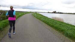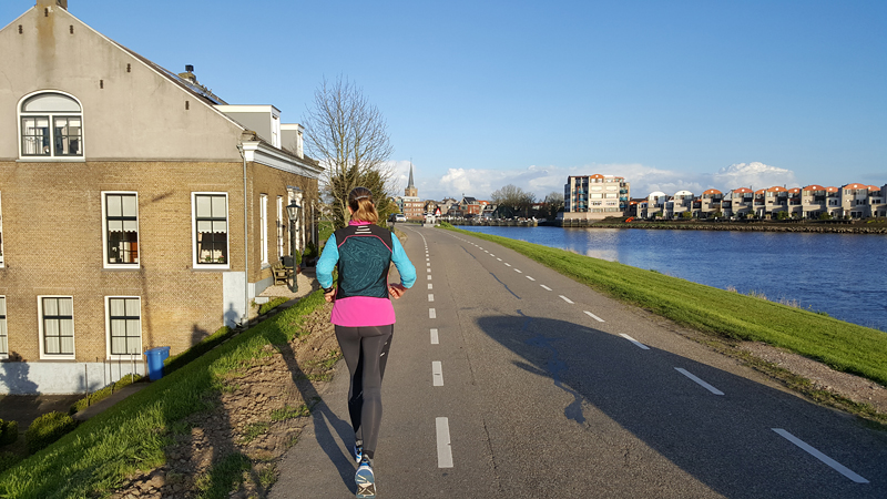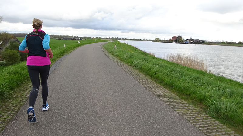Ik mijmer verder over lopen, over de verschillende methoden van training, over progressie en over voeding. Voordat ik er erg in heb, zitten de eerste 15 km er alweer op en loop ik weer over de dijk. Het weer is echt prima. Geen wind, en een lekkere temperatuur. Ik loop nog steeds op 6.30 min/km dus ik ben wel tevreden eigenlijk. Ik sla eens aan het rekenen hoe ver ik gelopen zal hebben als ik de dijk helemaal omloop en dan weer via het natuurgebied terug ga naar de auto. Ik gok dat dat nog ongeveer 3 kilometer zal zijn en daarom klok ik aanvankelijk af op een looplap van 15 km (na de warming up van 1,2 km). Die liep ik dus inderdaad op 6.29 min/km gemiddeld en net 1 zone boven MAF. Prima dus en zeker voor het gemak waarmee het allemaal ging. Ik las geen pauze in maar loop direct verder maar weer binnen MAF. Dat is even schakelen natuurlijk want na 15 km een beetje op tempo en een net iets hogere hartslag, moet ik ook weer de lagere zone even opzoeken. Maar juist doordat ik geen rustpauze inlas, is dit een prachtige training. Je ‘bent’ er immers al bijna en dat is dan eigenlijk nog helemaal niet zo. Ik moet nog even door! De langzamere pre cool down (zo noem ik het maar even) klok ik af na 2 kilometer. Na ruim 19 km sta ik weer bij de auto. Ik ben niet moe, maar het is op zich voor nu even genoeg en woefje moet ook eten.