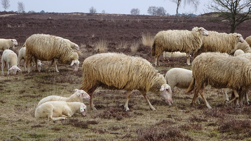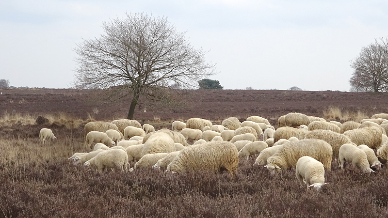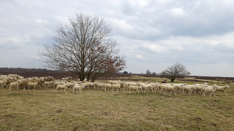 Al snel zijn we bij de afslag naar rechts, en steken we even de weg over richting de heide. We kiezen vandaag voor de korte route die ongeveer 15 km zal zijn. Op de heide moet woef even aan de riem in verband met de schaapskudde en voor het eerst in al die tijd dat we hier lopen, staat de kudde vlak langs het pad. Dat is wel erg leuk, zeker met de lammetjes die overigens al heel groot zijn en blijkbaar in de winter binnen zijn geboren.