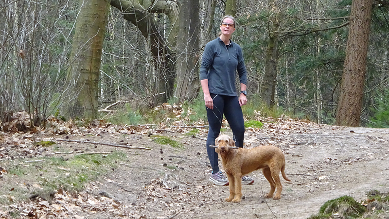 Om nog wat uit te lopen, maken we nog een extra lusje en we zien dan dat woef echt nog niet moe is. Ze rent vrolijk rond met een stok. Bovendien kijkt ze tevreden en blij dus dat zit wel goed.