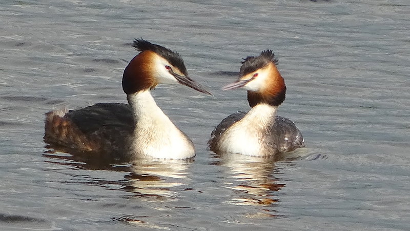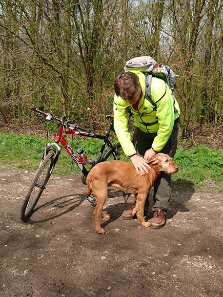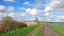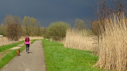 Maar ik word wel een beetje tureluurs van dit stomme gesukkel met bochtjes en kleine stukjes. We besluiten dus toch maar gewoon even over de weg te gaan lopen en even serieus een rondje te doen. Grappig genoeg gaat woef gewoon op het gras naast het fietspad lopen dus dat is ook prima. Wij lopen nog steeds heerlijk in het zonnetje maar naar het oosten toe is de lucht enorm grijs! Maar wij boffen en genieten van het zonnetje, de luchten en de vogels overal. We zien zelf de eerste jonge Nijlgansjes.