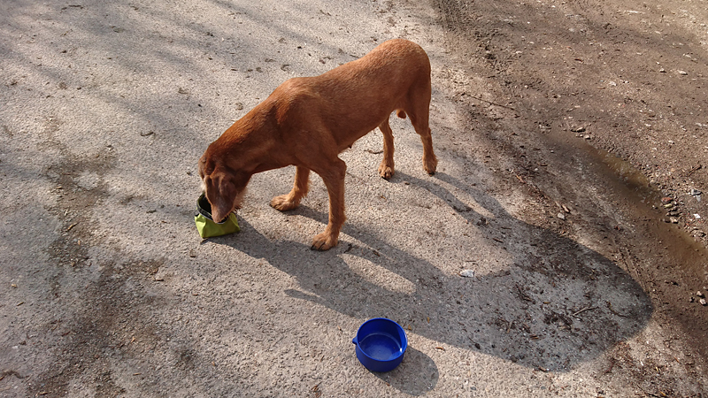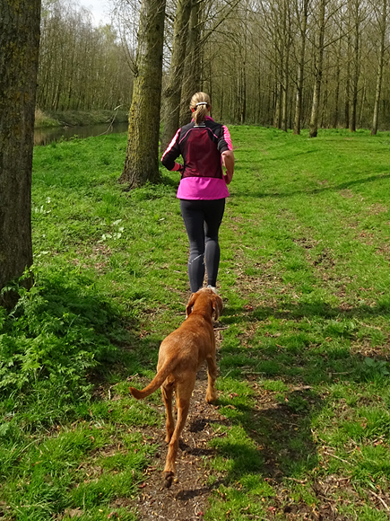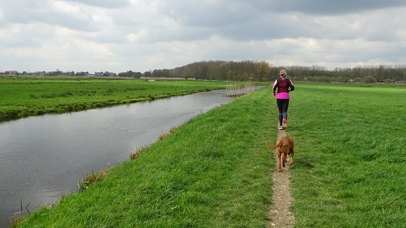 Na het pad langs het water waar de ooievaars voorheen broedden, lopen we naar het oude deel om daar off road te lopen. Maar er blijken schelpjes gestrooid te zijn en die zijn scherp voor de zooltjes van woef dus gaan we maar weer naar het andere deel en pakken eerst een rondje rond de ijsbaan. Dat is ook onverhard.