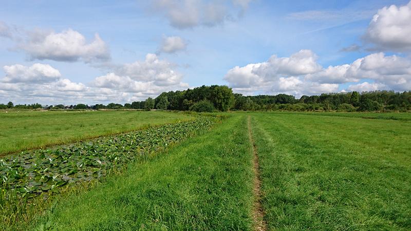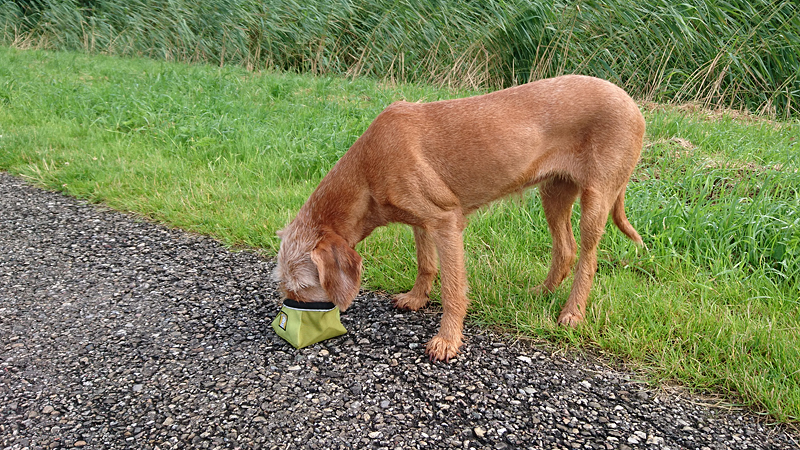 Ik neem rustig de tijd voor de warming up en we lopen lekker in de schaduw zo aan het begin van de run. Daarna gaan we naar het andere deel en lopen we dus zonder enige beschutting. Maar gelukkig is het nog niet erg warm en de bewolking is heerlijk. Weinig wind, af en toe een zonnetje en niet extreem vochtig. Prima dus en ik ben benieuwd hoe ver we (samen) komen. Aan het begin van een run kan je daar eigenlijk nog niks van zeggen. De eerste 5 kilometer zitten er natuurlijk snel op en woef krijgt wat te drinken. Dat wil ze wel! Daarna gaan we een stukje offroad richting het oude ooievaars nest. Het gras is namelijk nog nat dus dat zal wel lekker zijn voor woef aan haar pootjes. Als ik zie dat ze aan het natte gras likt, krijgt ze weer wat water. Dat water gaat hard deze keer zie ik al dus misschien moet ik daar straks iets mee als ze mee blijft lopen.