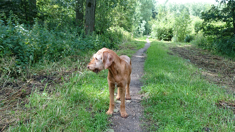Gisteren heb ik niet gelopen en vandaag heb ik het plan om een wat langere run te doen als het lekker gaat. Ik heb mijn kleding half aan want ik ga eerst woefje uitlaten en daarna op pad. Maar als ik naar buiten kijk, zie ik bewolking en dat betekent dat ik woef wel lekker mee kan nemen. In ieder geval op een stukje van de route. Ik kleed me dus weer om en ga op pad met woef. Watertje voor haar in mijn rugzak en haar bakje. Eigenlijk zit dat gewoon standaard in mijn rugzak. Alleen haal ik de schoentjes en haar ‘nood’ voer er nu uit want met het warme weer is iets minder gewicht wel lekkerder op mijn rug en al helemaal omdat mijn shirtje niet helemaal droog is na het wassen van gisterenavond. Vreemd maar waar.