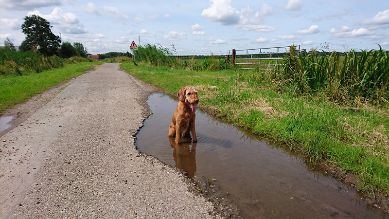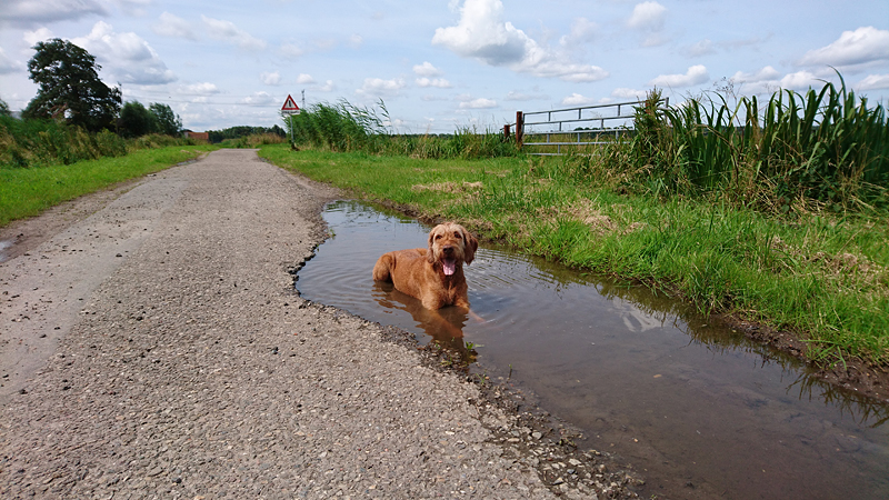 Inmiddels gaat het best goed qua afstand. Ik maak nog wat lusjes en reken uit wat ik ongeveer nog moet lopen voordat ik terug kan gaan richting het andere deel van Hitland. Ik loop nog een keer de lange arm richting de dijk en gelukkig ligt daar een grote diepe plas. Daar wil woefje wel even in afkoelen en dat mag ze natuurlijk.