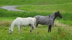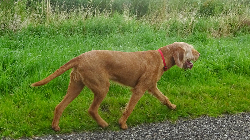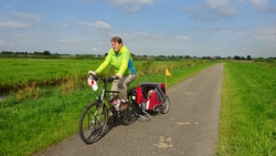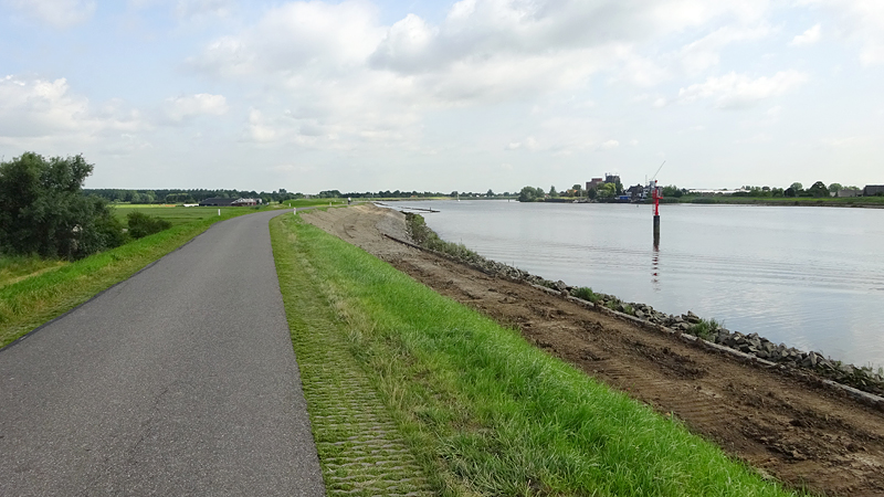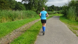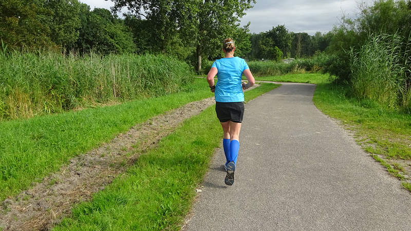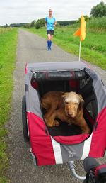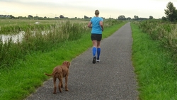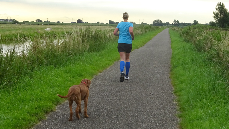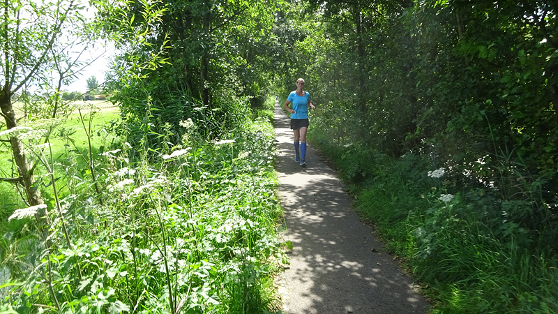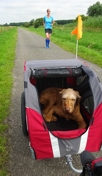 Het is bewolkt maar wel warm en er staat eigenlijk geen wind. Het voelt op zich allemaal wel OK, zeker als de zon weg blijft maar het is niet optimaal loop weer. Ik merk niets van mijn benen maar na een kilometer of tien heb ik het idee dat ik gisteren misschien wel erg weinig gegeten heb zo met al dat fietsen. Ik loop nu heel rustig en zou dus eigenlijk gewoon ‘op niks’ moeten kunnen lopen zoals ik normaal ook altijd doe. Maar echt soepel gaat het niet. Het loopt allemaal wel lekker, maar ik heb niet het idee dat ik nou even makkelijk 40 km kan wegtrippelen vandaag. Maar eerst eens kijken hoe het allemaal loopt. Woefje heeft na 5 en 10 km al water gekregen en die hobbelt tevreden mee. Na een kilometer of 15 doen we haar maar even in de kar omdat ik toch wel richting de 25 km wil gaan lopen vandaag. Zo kunnen we ook straks even over de dijk om even ergens anders te lopen nu.