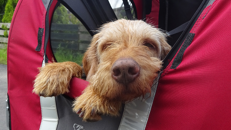 We laten woef nog een klein stukje uit de kar en doen haar voor het allerlaatste stukje er weer in omdat de zon nu toch ineens behoorlijk schijnt. We zijn erg lang onderweg geweest omdat we zoveel tijd kwijt zijn geweest bij het kijken naar de chaletjes en de kavels. Niks aan te doen. Het is lekker weer en we zijn fijn buiten. Maar inmiddels moet het ook maar eens klaar zijn en als we ruim 30 km op de teller hebben staan, is het ook welletjes geweest.