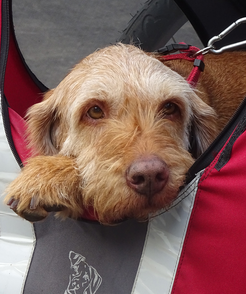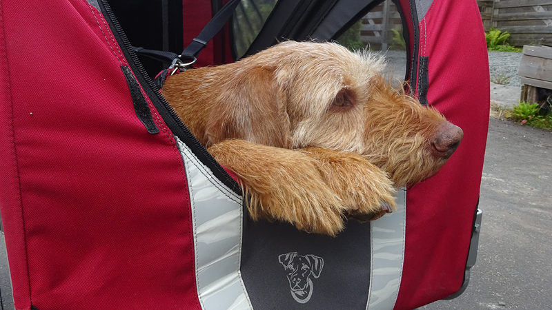 We hobbelen over de dijk en als we bij de steenovens zijn, is het water bijna op. We besluiten bij het eetcafe even bij te vullen maar terwijl we daarheen lopen, besluiten we dat we dat wel even bij de receptie van het park kunnen doen. Als ik in de vitrine naar de huisjes sta te turen na het vullen, worden we aangesproken of we misschien informatie willen. Dat wil ik zeker, en niet zozeer voor mij maar wel voor een vriendin misschien. Ik weet namelijk dat er enkele huisjes met permanente woonbestemming op het park zijn en toevallig zijn er twee te koop. Daar wil ik wel informatie over en we krijgen een info pakket en een plattegrond. We besluiten even naar de kavels te gaan kijken waar nu twee bouwvalletjes opstaan. Een van de kavels is 1000 m2 en lijkt te groot, de andere is kleiner maar ligt ook wel aardig. Misschien is het wel wat en ik ga daar dus een mailtje van maken voor mijn vriendin. Het kijken en foto’s maken kost ons ruim een uur. S krijgt ook nog een telefoontje als we staan te kijken naar de kavels en ondertussen maak ik schattige foto’s van woef die op haar gemakje in de doggyride ligt te dommelen.