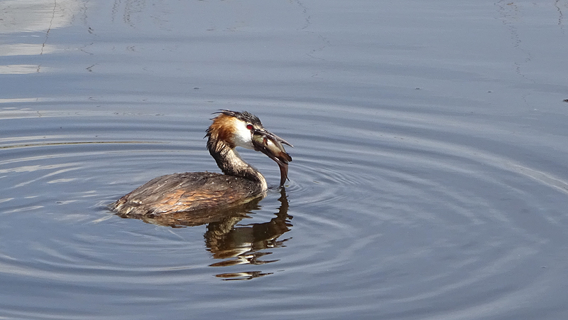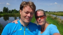 Na dit intermezzo kom ik maar moeilijk op gang maar uiteindelijk lukt het toch. Ik heb mijn energie voorraad toch maar aangevuld met wat dextro snoepjes die ik altijd bij me heb voor de zekerheid. Misschien placebo effect maar het gaat in ieder geval weer wat makkelijker. Inmiddels zijn we ook de 20 km gepasseerd en lopen we dus nog even verder. We slingeren weer over de korte arm, de lange arm en lopen weer langs de kalfjes. Nou niks kalfjes, want ze zijn niet te zien. Grappig dat ik ze gisteren dus wel zag. We zien ook nog een fuutje met een enorme vis die hij probeert weg te slikken. Omdat we toch stilstaan omdat we even gekeken hebben, maak ik een selfie van S en mij.