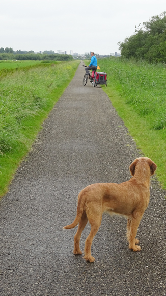 Maar op een gegeven moment wordt het toch wel tijd om eens wat te gaan doen en aangezien wafje ook moet eten, vertrekken we voor ons korte rondje. De doggyride gaat mee, omdat we niet weten of woef het wel leuk gaat vinden vandaag na alle runnetjes en tochtjes. Overigens blijkt zij het beter te doen dan wij want is vrolijk en blij!