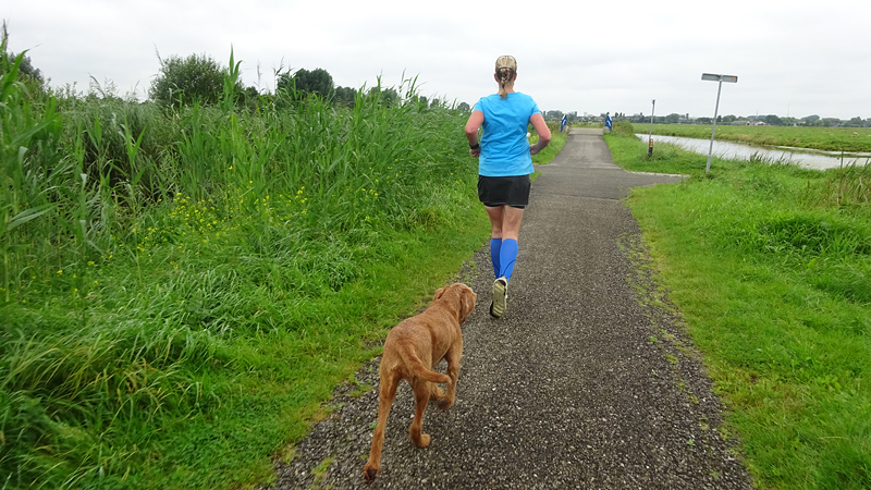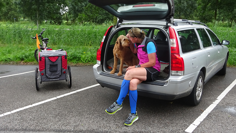 Zo hobbelt woefje toch nog 5 km lekker met ons mee en dat is ook wel prettig voor haar. Na ruim 20 km staan we weer bij de auto. Vanavond nog even op de racefiets een stukje rijden!