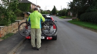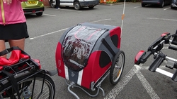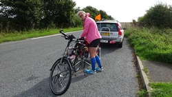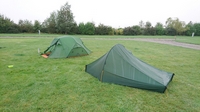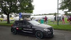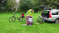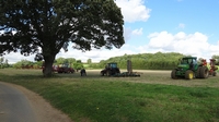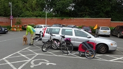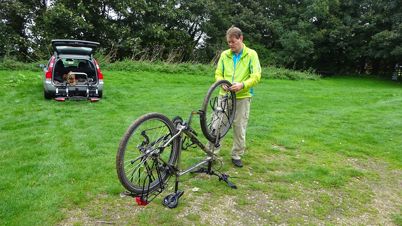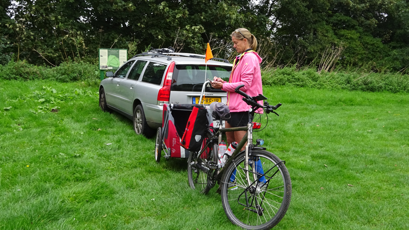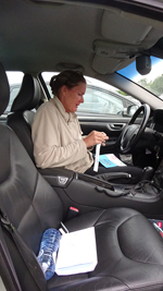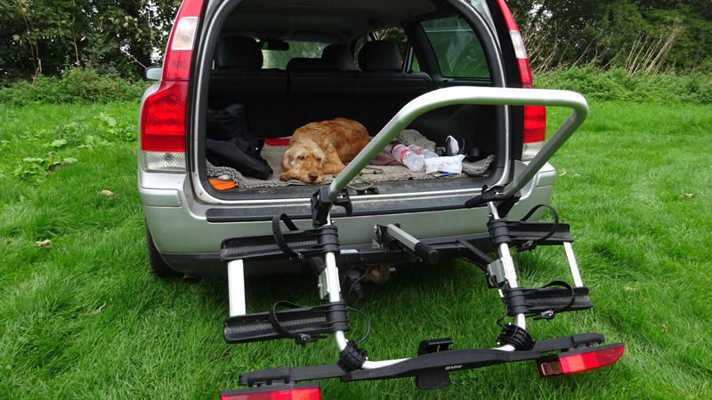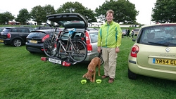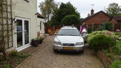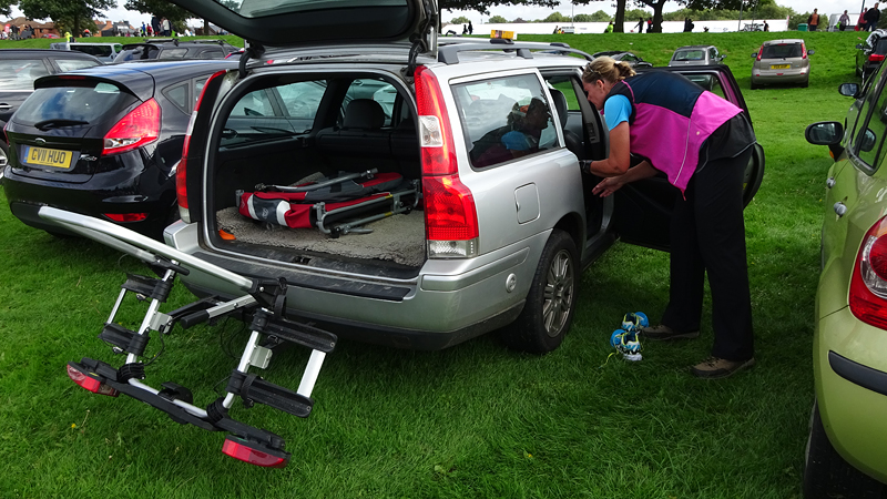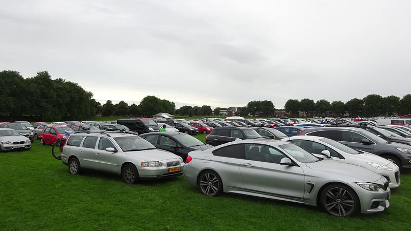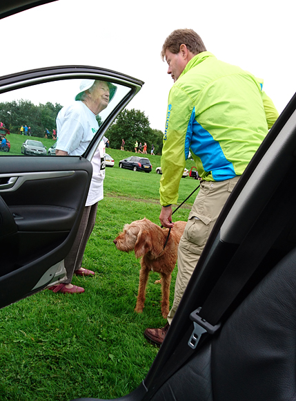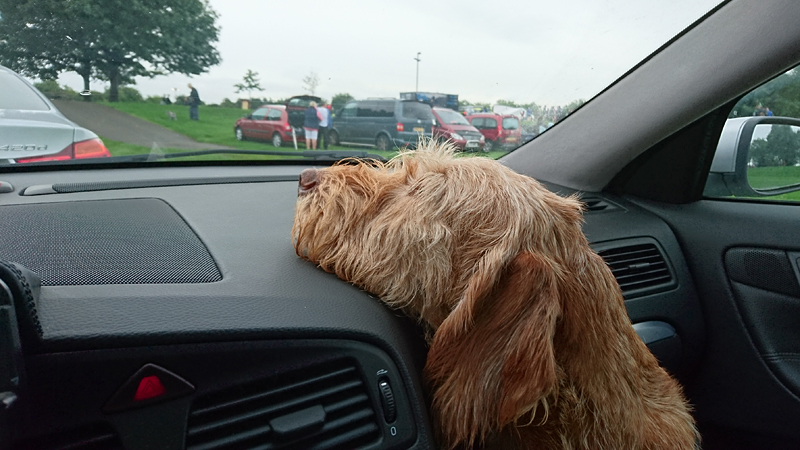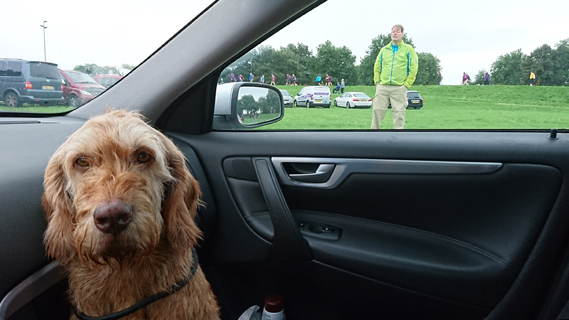 Op 38 km van de bestemming stoppen we even voor een plasje en om te tanken en dat doen we nogmaals op 11 km voor de bestemming. Daarna rijden we om 8 uur het terrein al op en rijden door naar het begin van het weiland en parkeren de auto. Dan begint het wachten want we zijn natuurlik veel te vroeg voor de start. Rond 9 uur zullen we pas richting startvak gaan. Het weer is aardig, geen mist en niet al teveel wind. Misschien iets te warm voor het fijne maar dat hoort er allemaal bij. Behalve vorig jaar was het iedere keer enorm warm. S. gaat even op het terrein kijken en ik blijf bij waf die even voorin zit.
