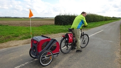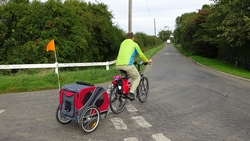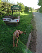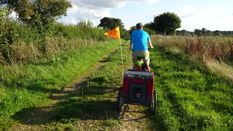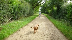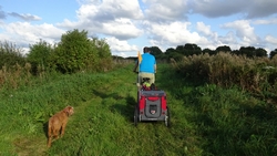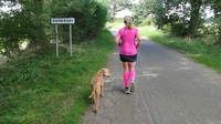 Zo mijmerend hobbel ik door. Het valt me niet mee maar dat hoeft ook niet tijdens een run. Ik ga straks S. ergens zien. Hij zal de vlag van de doggyride omhoog houden en dat blijkt een gouden greep. Ik herken hem heel makkelijk! Ik pak snel tijdens het lopen de spons, wis mijn gezicht even en loop door. S. rent daarbij met me mee.