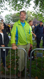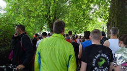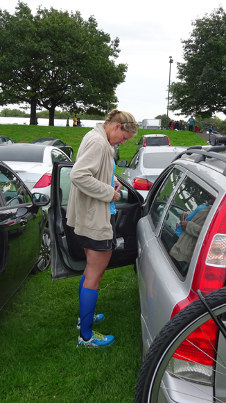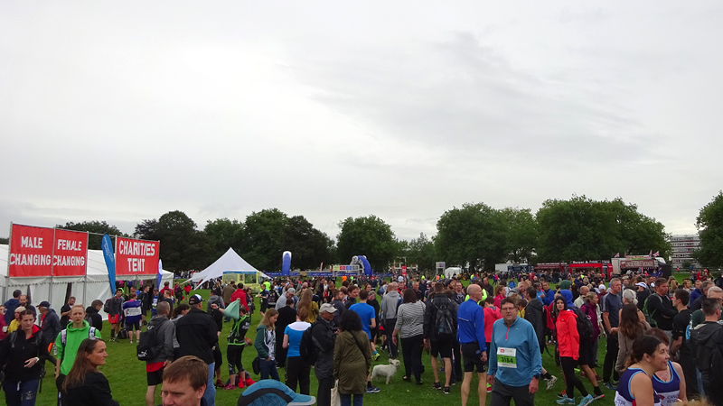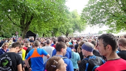 Daarna gaan we dan toch maar eens richting de startvakken en de dixies. Ik dring een beetje voor, doe nog een plas en daarna wandelen we over het weiland. Het gras is best hoog en een beetje nat. Maar ik krijg gelukkig geen natte voeten dus dat valt weer mee. Het veld loopt nu toch wel snel vol maar je zou niet zeggen dat hier een kleine 10.000 man aan de start verschijnt. De sfeer is gemoedelijk en rustig. Woef zit overigens nog wel in de auto. Dat kan prima qua temperatuur en straks haalt S. haar weer op en zal met haar gaan fietsen in de kar om mij daarna langs het parcours te zien.