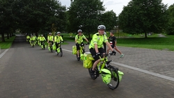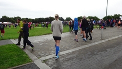 Ik zie de vlag en zie S. rechts bij de uitgang van het park. Helaas komt er net met veel geschreeuw een rolstoeler aan ie ook rechts de meute voorbij wil. Ik kan gelukkig nog naar rechts. Softflask wisselen en de spons aanpakken. S. rent zich rot om me een klein stukje bij te houden. Niet dat ik nu zo snel ga, maar hij staat daar rustig en ook nog eens met alle spulletjes in zijn hand en dan bedenk ik ineens wat ik eigenlijk wil. Wat een schat is het ook! Ik ben blij met mijn spons en waterflesje en loop weer door. Op naar de derde lap van 5 km.