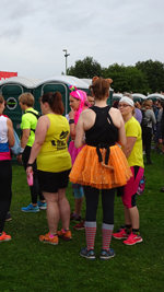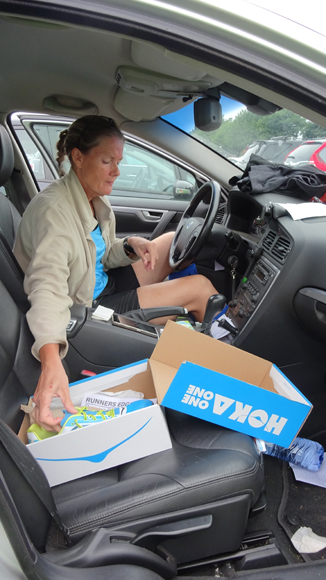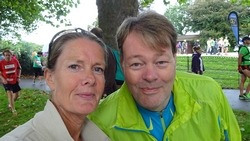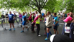 Als S. terugkomt, wordt hij aangesproken door een oude dame die naast ons staat. Ze probeert S. van alles uit te leggen. Dat ze 82 is, 20 jaar marshall was geweest en nu de mini marathon loopt oor een goed doel. Maar vooral probeert ze te vertellen dat ze een prijs heeft gewonnen. Het krantenartikel zit zelfs op haar shirtje gespeld en ze wappert met een papiertje voor S. die er weinig van begrijpt. Grappig dat zulke dingen zo belangrijk zijn voor mensen. Ik lig in een deuk en ga ondertussen maar vast mijn nummer opspelden en mijn schoenen aantrekken. Ik ben wel benieuwd hoe de nieuwe schoenen lopen. Elk jaar was hier wel wat qua schoenen. Het allereerste jaar kwamen er per ongeluk verkeerde schoenen uit de tas, tijdens de marathon moest er een zooltje uit de Kinvara en kreeg ik mijn schoen niet los onderweg. Dit jaar gaat het vast allemaal prima.