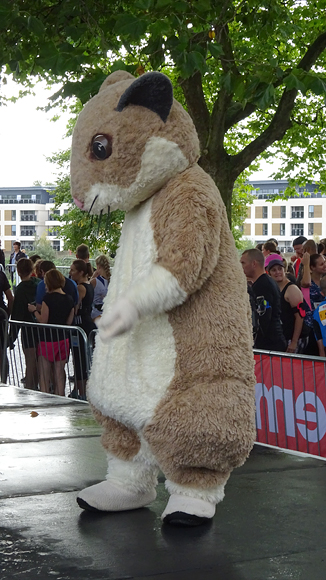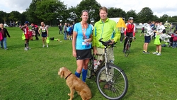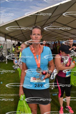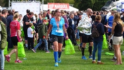 Ik krijg de medaille en een tasje met water en ga op zoek naar S. Ik zie het vlaggetje al maar dan krijg ik iets keihard tegen mijn hoofd aan. Een champagnekurk die een idioot kennelijk de mensen inschiet. Wow dat is hard! Gelukkig heb ik een hard hoofd en ik loop naar S. en woefje die allebei blij staan te wachten. Iemand maakt nog een foto van ons samen.