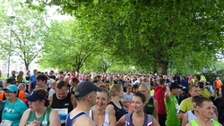 Het is best koud om te wachten en ik spring wat op en neer en kijk om me heen. Ik heb al lang geen idee meer hoe de route loopt ook al heb ik gisteren daar wel serieus naar gekeken. Het is een route die niet te onthouden is met al die rare bochten dus dat is dan jammer. Ondertussen maak ik een plannetje voor de run. Ik wil elke 5 km in 31 minuten lopen. Dat is langzamer dan in Edinburgh waar ik natuurlijk onder de 30 minuten liep en op een prachtige tijd uitkwam.Maar dit heuvelachtige parcours zal al lastig genoeg zijn en dus maak ik dit plannetje. Ik hoop rond de 2.11 uit te komen als finishtijd vandaag. Daar zou ik heel blij mee zijn. In 2011 liep ik hier 2.19 en in 2015 liep ik 2.17 dus dat zou al ambitieus genoeg zijn. In 2015 maakte ik overigens nog de fout om (weer) mee te gaan met een pacer. Dit jaar zou ik dat niet doen. Mijn eigen plan trekken en zo proberen te lopen.