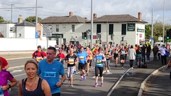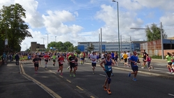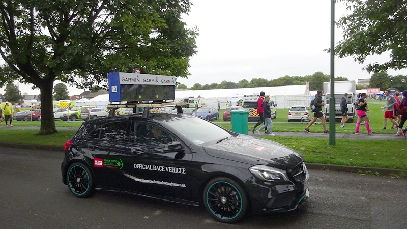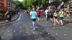 Dan kan ik ook eindelijk weg. Het begin is erg druk. Ik kijk op mijn horloge en zie dat de eerste kilometer al achter ligt op mijn schema. Dat valt tegen en komt alleen door de drukte. De tweede kilometer gaat iets sneller en ik ben weer bijna op de schematijd. Dat gaat dus weer een stuk beter. De route is heel anders dan vorig jaar en meteen moeten we al klimmen. Dat valt niet eens mee maar ik ben inmiddels wel wat gewend en loop stug door, schakel qua ademhaling en ren weer naar beneden. Ik weet dat we richting castle gaan en dat het daar echt even omhoog loopt. De route is echter vernieuwd, want we nemen een andere weg over grote keien. Rechts loop een marshall als een idioot te fluiten en te proberen mensen van de stoep weg te krijgen. Niemand die snapt waarom hij dat wil maar dan ineens komt de hele meute tot stilstand. Werkelijk totaal tot stilstand. Wat is er aan de hand? Achteraf vermoed ik dat de marshall probeerde de meute wat meer te laten trechteren zodat de stroom smaller zou worden en alsnog langs het castle zou kunnen. Wij dus niet en ik hoorde van een andere loper die achter me liep dat het later was opgelost. Maar hier stond ik dan. Ik bleef op de plaats dribbelen omdat ik bang was dat ik anders zware benen zou krijgen. De tijd tikt door en ik ga heel erg mijn best doen om hier even niet aan te denken. Straks gewoon weer opnieuw beginnen en doen alsof dat niet gebeurd is. Ik zie dat er ruim een minuut voorbij is als we weer op gang komen. Niet aan denken nu. Gewoon doorgaan. Ik hobbel over keien omhoog en het volgende stuk is zwaar. Omhoog en omlaag. Vervelender dan vorig jaar. Niet zeuren, gewoon doorlopen. Beetje tijd inhalen bij de stukjes naar beneden, schakelen en goed met hoge cadans omhoog. Zo heftig is het allemaal niet het is alleen geen biljartlaken. Liep ik gisteren niet gewoon over twee kilometer omhoog? Nou dan, dan stelt dit dus niets voor.