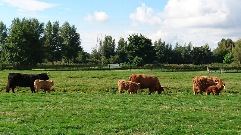 Als ik weer op het open stuk ben, ga ik continu lopen. Wat zal ik eens gaan lopen? Geen idee, eerst maar eens kijken hoe ver ik kom. Ik hobbel naar de dijk en weer terug naar de kalfjes. De kalfjes staan allemaal dichtbij en het is zo leuk om naar te kijken! Maar aangezien ik continu wil lopen, maak ik geen enkele foto. Misschien straks nog als ik er weer langs loop. Nu kijk ik alleen en geniet ik van het kleine ding dat mal door het weiland springt.