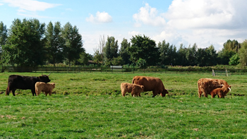 De kalfjes liggen aanvankelijk allemaal lui in de wei maar als ik even sta te kijken, staan ze allemaal op. Op een gegeven moment staan ze ieder precies voor hun eigen moeder. Ik maak snel een kiekje. Jammer dat ik alleen de telefoon bij me heb! Maar ze staan er wel op.