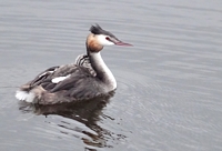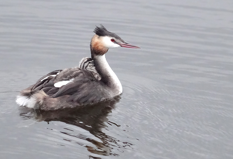 We hobbelen snel richting de kalfjes en ik zie dat moeder fuut weer rondzwemt met haar jonkie. Het is er maar eentje maar wel schattig natuurlijk! Helaas is het bewolkt en donker en zitten ze wat ver weg maar toch wel goed te zien op de foto: