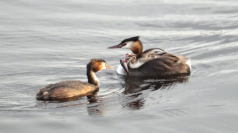 Na het maken van de foto gauw verder richting de kalfjes. Die grazen vredig samen met hun moeder en de grote stier. Misschien zijn ze wel weg als ik terug kom! Ik keer om aan het einde van het weggetje en zie op de terugweg nog net dat vader fuut komt aanzwemmen met een visje voor zijn kleintje. Klik!