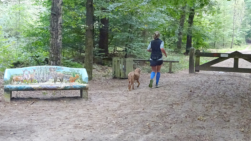 Ik zoek de tribune af en zie het oranje vlaggetje van de doggyride zwaaien. Daar is hij! Ik zwaai ook. Blij natuurlijk maar ik wil ook even rustig doorwandelen na deze run. Ik wandel door richting de uitgang en de medailles. Daarna loop ik het stadion uit en zie ik S. ook weer. Dat is dus een mooi resultaat en ik ben heel tevreden. Ik ben erg benieuwd naar mijn hartslag bij deze run maar ik weet al dat ik netjes over de 160 ben gekomen omdat ik dat in beeld zag toen ik af klokte en een ander scherm tevoorschijn toverde. Verder heb ik niets gezien onderweg en het lichtje met de hartslag zone aanduiding had ik afgeplakt. Achteraf lees ik uit dat ik alleen in de laatste kilometer boven de 158 heb gelopen en maximaal 164 haalde. Dat is dus opvallend en een mooi resultaat ook.