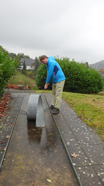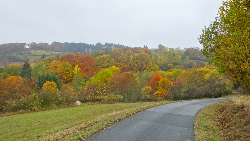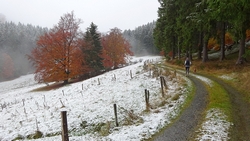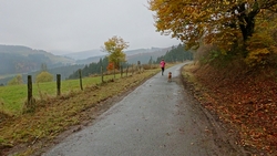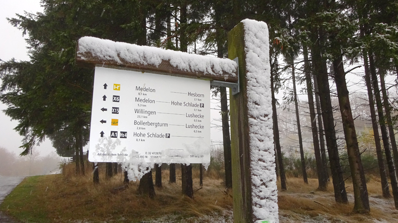 Als we weer bij de parkeerplaats uitkomen, besluiten we het te doen. De klim naar de Bollerberg(turm). Dat zal niet meevallen en we besluiten gewoon even ieder onze eigen weg te kiezen. Ik denk dat ik het wel zal redden maar met de fiets lijkt me dat uitgesloten. Veel te steil. Ik hoop alleen dat de weg niet al te glad zal zijn maar we doen gewoon voorzichtig. We slaan dus linksaf en starten de klim….