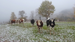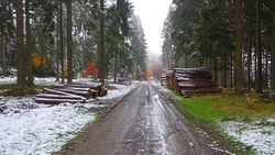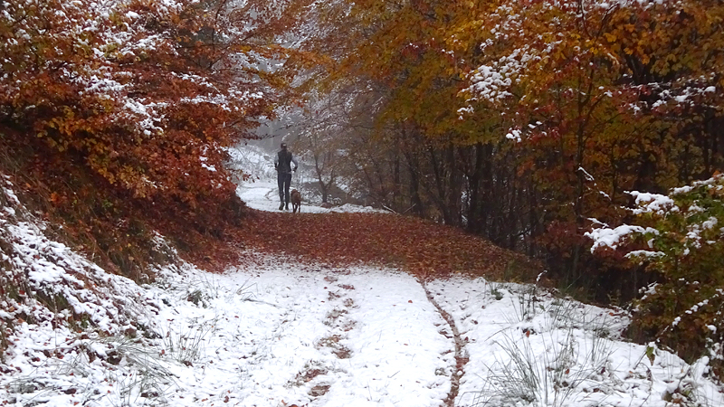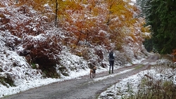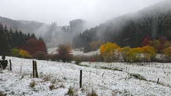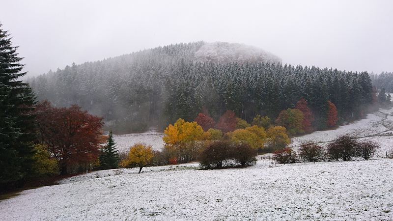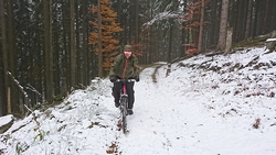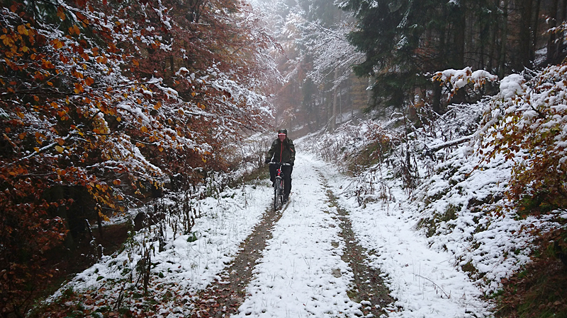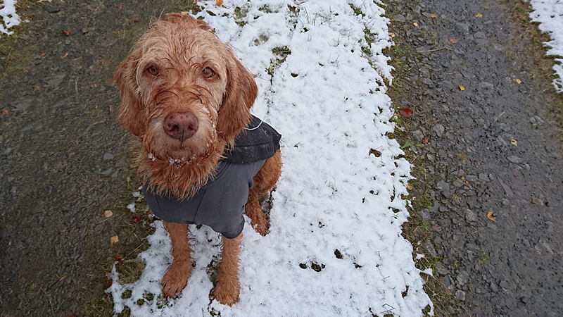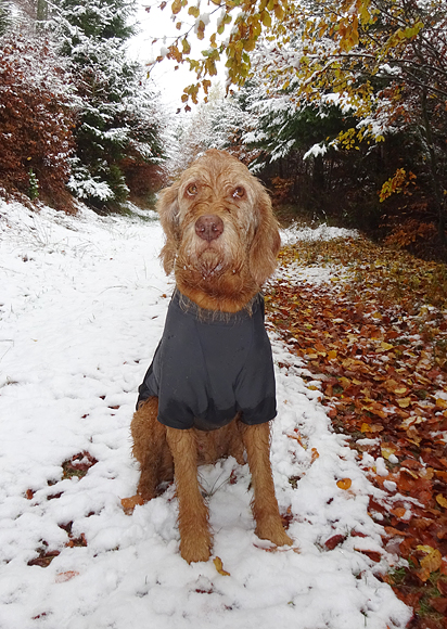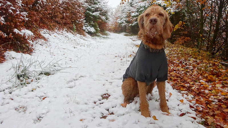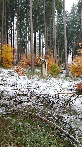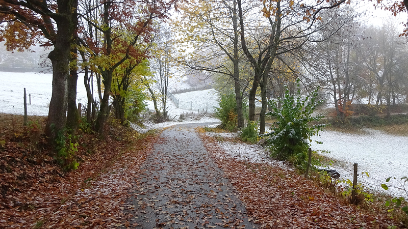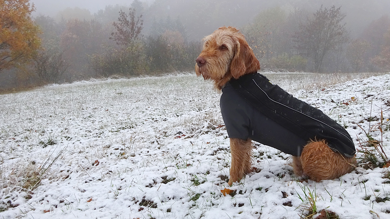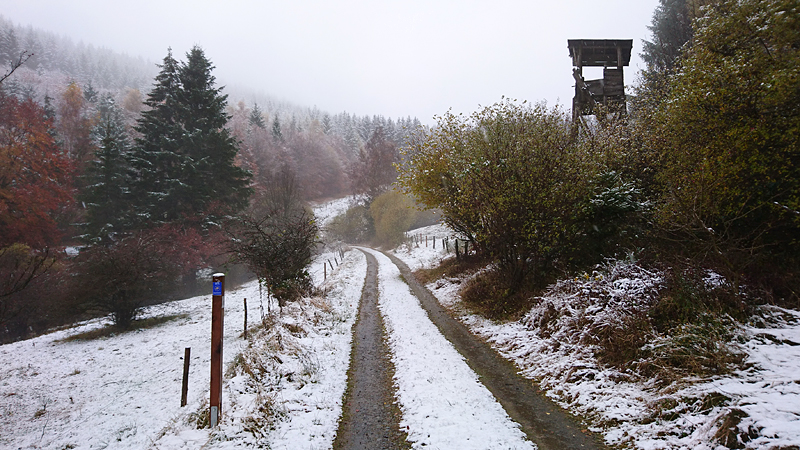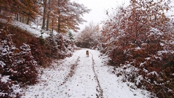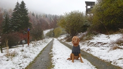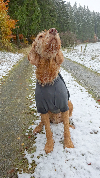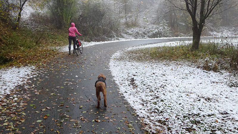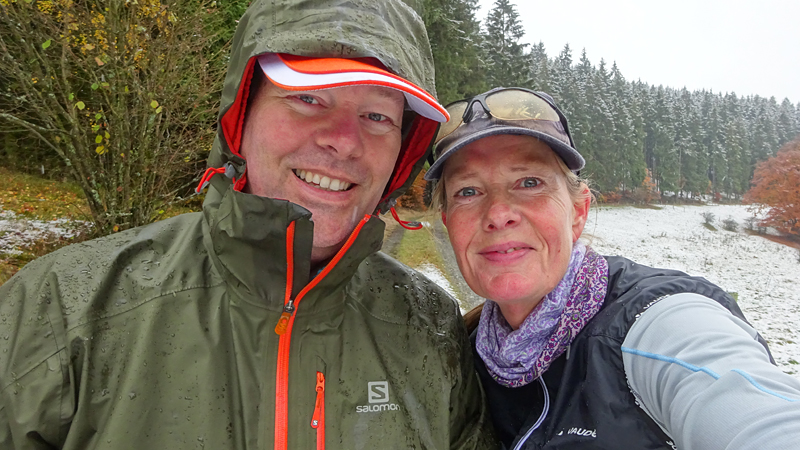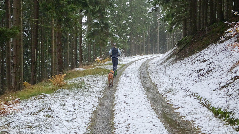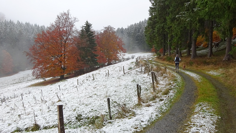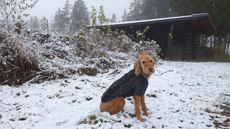 Gisteren lag er een prachtig laagje poedersneeuw in de ochtend dat helaas in de middag alweer grotendeels verdwenen was. Maar de natuur zou de natuur niet zijn om ons vandaag weer te verrassen. Als we naar buiten kijken, zien we dat het wederom gesneeuwd heeft. Er ligt net iets meer dan de vorige ochtend. Misschien blijft dat wel langer liggen! We zijn dus reuze benieuwd naar de route(s) en gaan na het ontbijt snel op pad. Ik had eigenlijk ook een route in Dreislar getekend, maar omdat die route lager ligt, willen we toch weer de bossen in om te kijken naar de sneeuw! Wafje krijgt de cloudchaser aan en we gaan gauw weg.