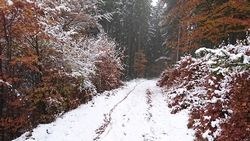 We slaan weer rechtsaf en komen weer uit op het brede pad. Dat is mooi schoon en daar kunnen we goed lopen en fietsen. Ondertussen bedenk ik waar we nu naartoe zullen lopen. Misschien naar de Bollerbergturm waar we uitzicht zullen hebben en waar zeker meer sneeuw zal liggen. De turm ligt immers op 780 mtr hoogte en de klim zal zeker de moeite waard zijn denken we.