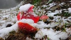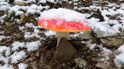 Als we weer verder lopen, zien we de vliegenzwammen weer staan. Deze keer verder bedekt door de sneeuw maar ze houden het nog vol zo te zien met de sneeuw op hun dakje.