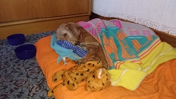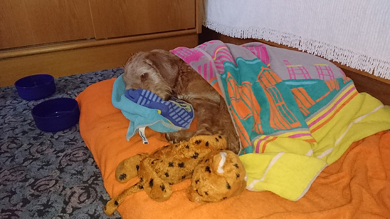 Waf vindt alles nog leuk. Ze blaft en praat veel onderweg, waarschijnlijk van de opwinding. Ik voelde al even op haar rug maar ze is lekker warm dus dat kan het niet zijn. Pootjes zien er ook prima uit dus dat gaat goed.