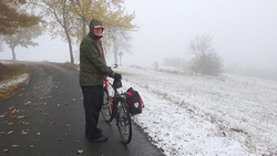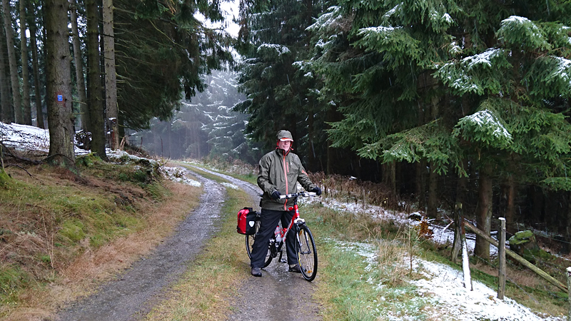 Na de korte stop bij het mooie uitzicht gaan we weer verder. Dat valt aanvankelijk even niet mee want dat stoppen zo in een forse klim is niet prettig. Maar het gaat goed en al snel ben ik weer in mijn ritme. Nu even door tot het einde dan maar! Langzamerhand komt er ook sneeuw op de weg en ik let dus goed op. S. maakt daar nog een foto van als hij op dat punt aankomt.