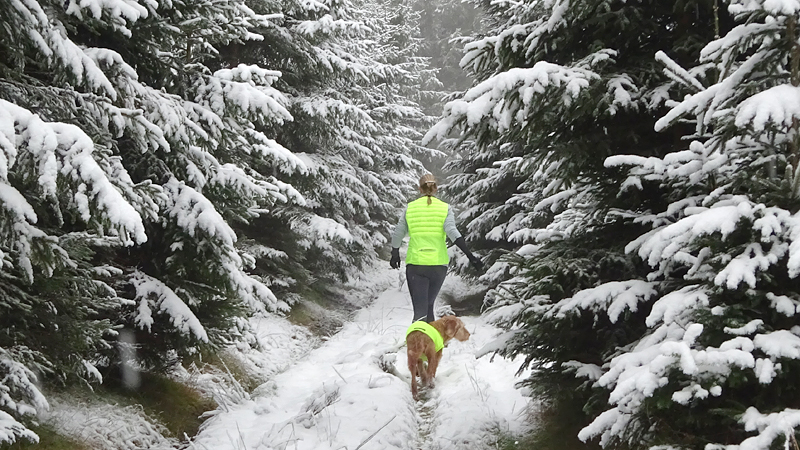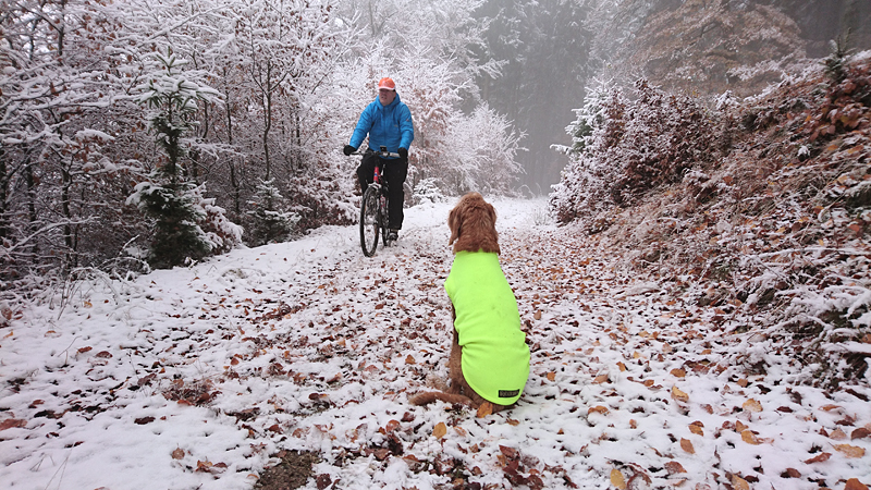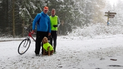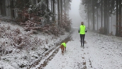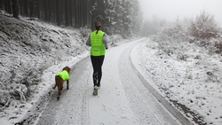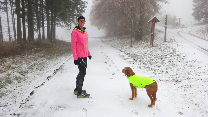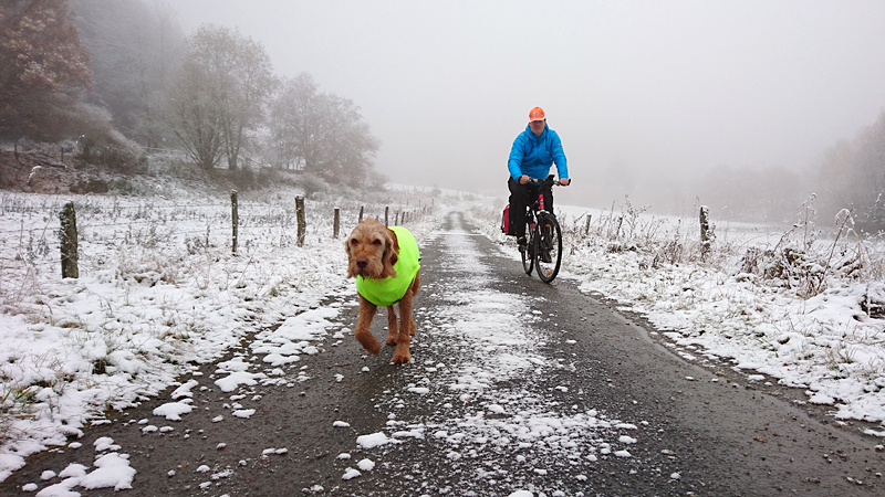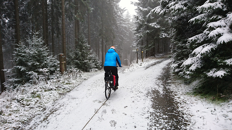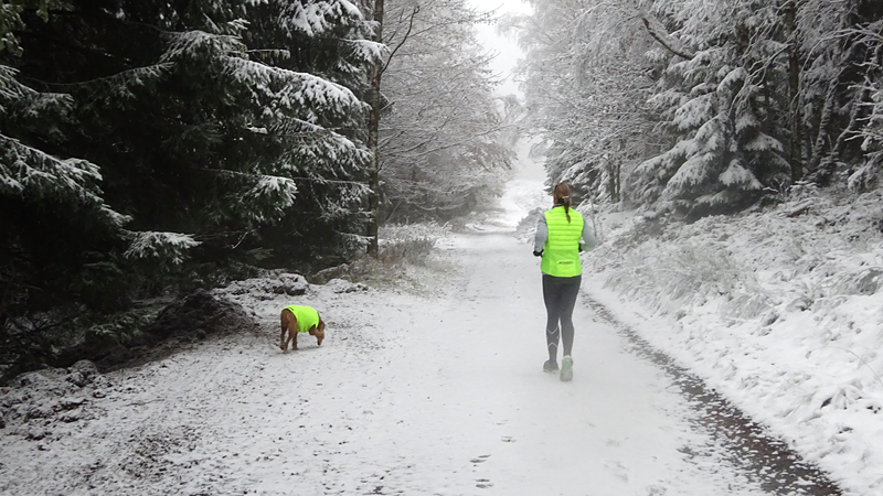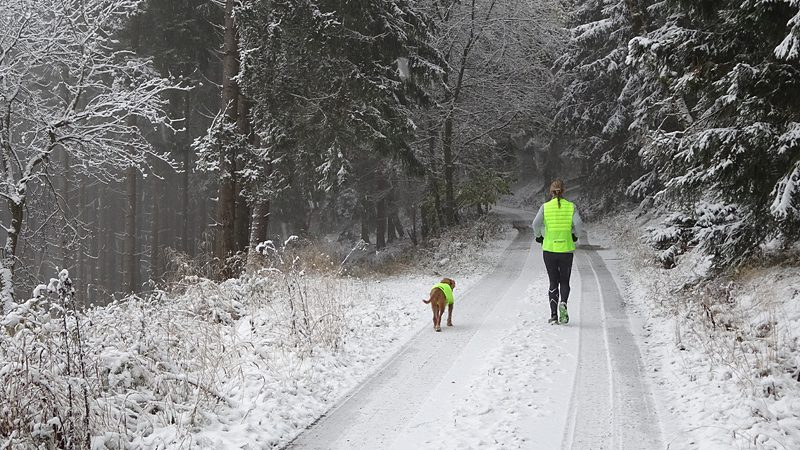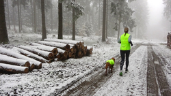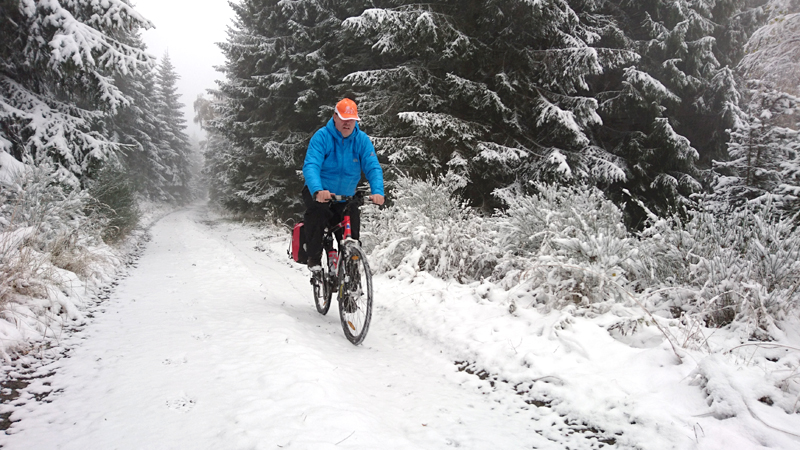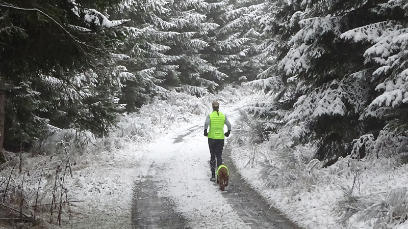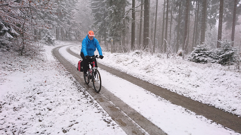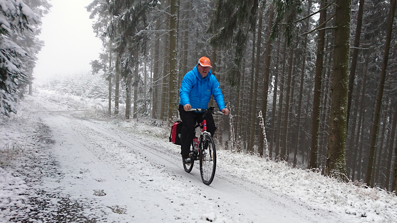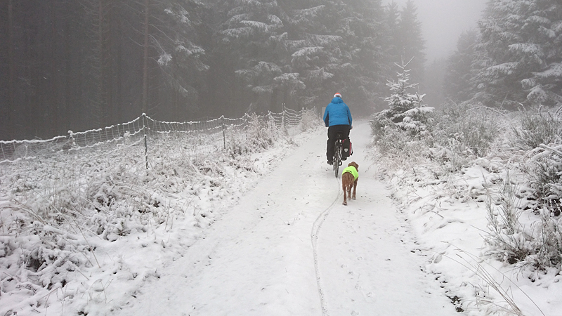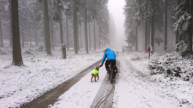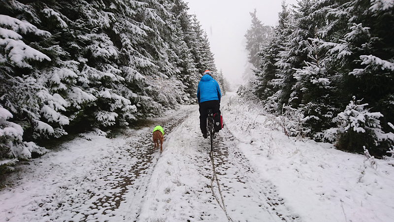 Vandaag ligt er weer meer sneeuw dan gisteren. Het is prachtig en we genieten volop. Woef trouwens ook want die vindt de sneeuw wel leuk! Het lijkt nog wel OK qua fietsen en hardlopen dus we gaan vol goede moed en zin op pad voor een nieuw rondje. Tot onze verrassing hebben we ontdekt dat het naar Winterberg maar 12 km is door het bos. Dat is met de auto een stuk verder. Toen we eens op de kaart keken, ontdekten we dat we de route ook iets konden inkorten. We hadden al gehoord dat de weg naar Winterberg aardig op en neer zou lopen qua hoogteprofiel dus we doen het even rustig aan en kiezen voor een iets kortere route vandaag. We hebben dus een route gemaakt van 18 a 19 km en dat lijkt ons prima voor deze ochtend met deze sneeuw. De route staat in de navigatie op de fiets dus we kunnen op pad zonder al teveel op de kaart te hoeven kijken en de weg zou een redelijk groot pad moeten zijn dus dat leek allemaal veelbelovend. Ik ga eerst even de voetjes van woef insmeren vanwege de sneeuw en S. gaat de fiets pakken.