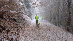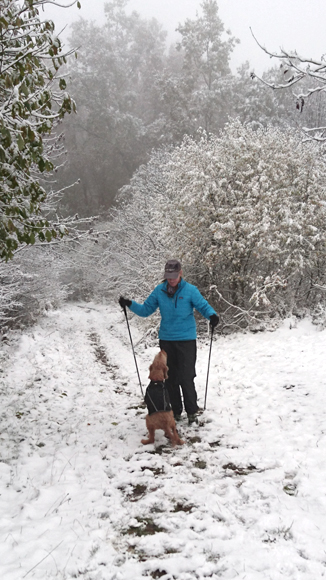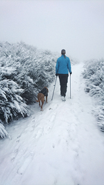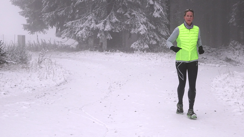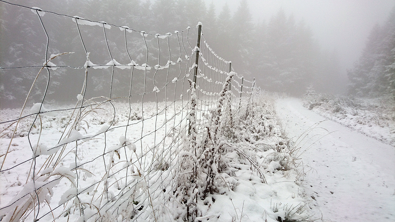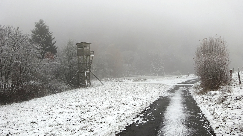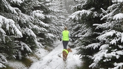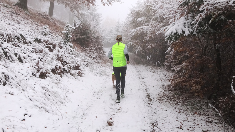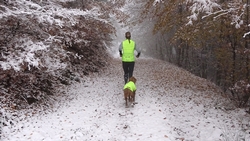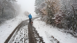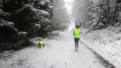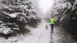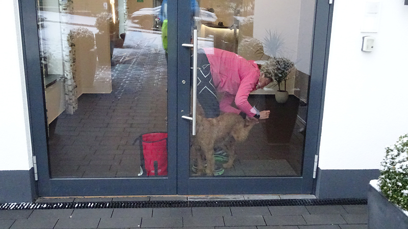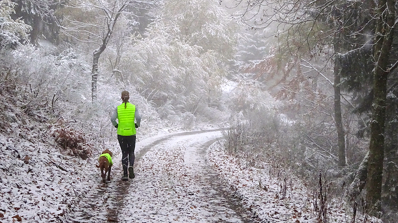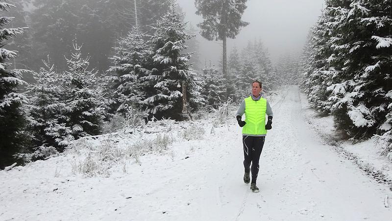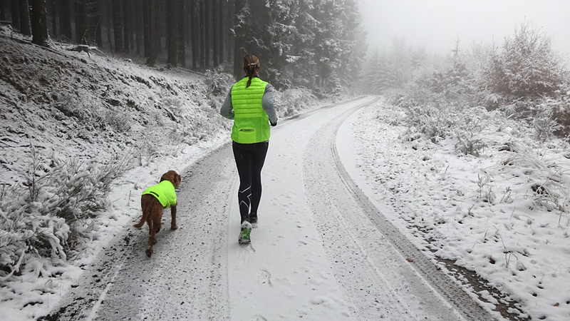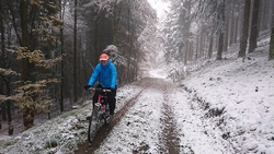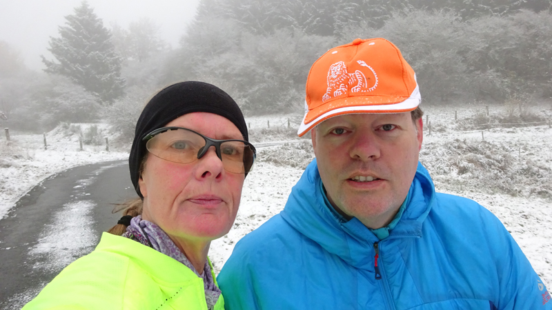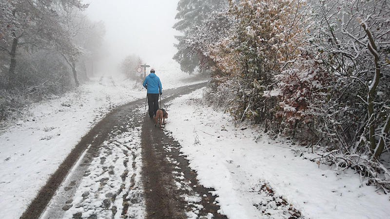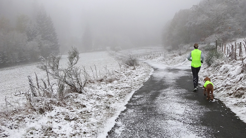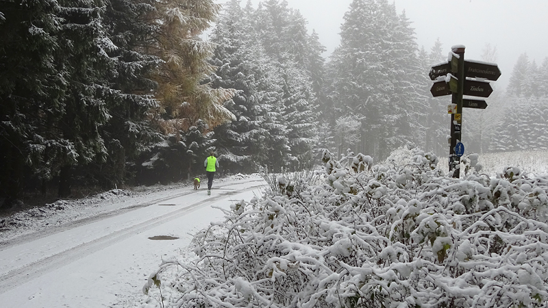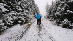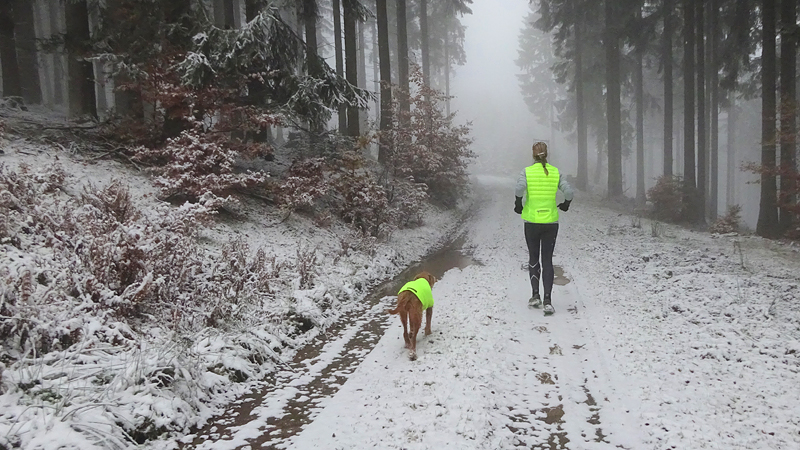 Vandaag ligt er weer meer sneeuw dan gisteren. Het is prachtig en we genieten volop. Woef trouwens ook want die vindt de sneeuw wel leuk! Het lijkt nog wel OK qua fietsen en hardlopen dus we gaan vol goede moed en zin op pad voor een nieuw rondje. Tot onze verrassing hebben we ontdekt dat het naar Winterberg maar 12 km is door het bos. Dat is met de auto een stuk verder. Toen we eens op de kaart keken, ontdekten we dat we de route ook iets konden inkorten. We hadden al gehoord dat de weg naar Winterberg aardig op en neer zou lopen qua hoogteprofiel dus we doen het even rustig aan en kiezen voor een iets kortere route vandaag. We hebben dus een route gemaakt van 18 a 19 km en dat lijkt ons prima voor deze ochtend met deze sneeuw. De route staat in de navigatie op de fiets dus we kunnen op pad zonder al teveel op de kaart te hoeven kijken en de weg zou een redelijk groot pad moeten zijn dus dat leek allemaal veelbelovend. Ik ga eerst even de voetjes van woef insmeren vanwege de sneeuw en S. gaat de fiets pakken.