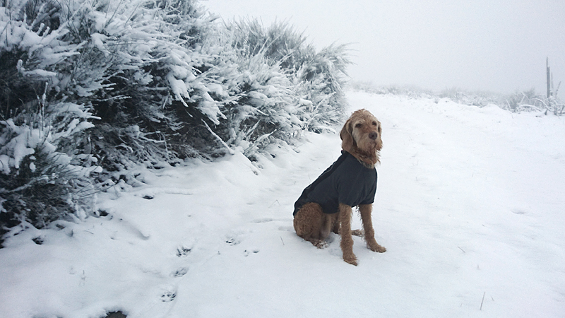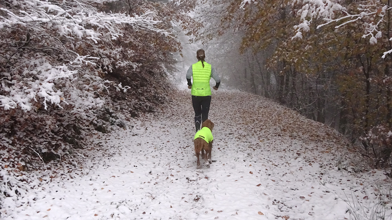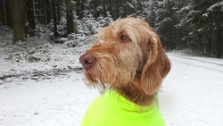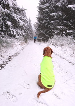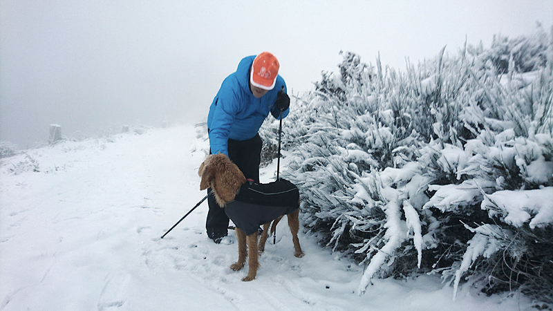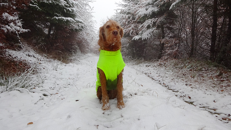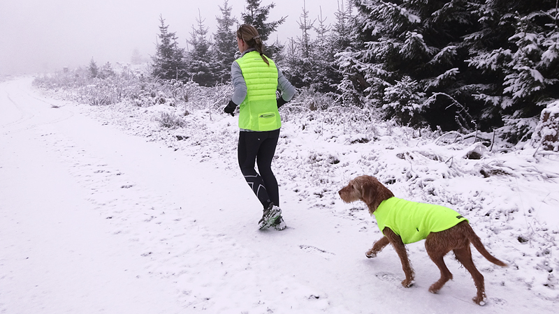Natuurlijk maken we weer wat foto’s van woef en van ons samen. Altijd leuk. Vormen waf en ik geen mooi stel zo samen in het geel? Valt wel op in de sneeuw. Toch denk ik dat de Cloudchaser beter zit omdat deze tankie toch een beetje gaat hangen bij haar buik als het nat wordt aan de buitenkant. Dat betekent dat ze dan koud wordt. Met de cloudchaser blijft ze lekker warm.