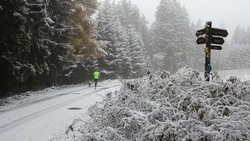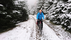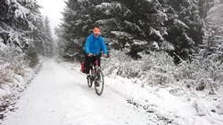 Na 4,5 km moeten we even een smaller paadje nemen dat ons naar de nieuwe route zal leiden. Daar ligt al best veel sneeuw en het is even ploegen, ook met de fiets. Maar wat een feest!