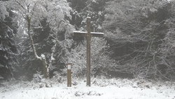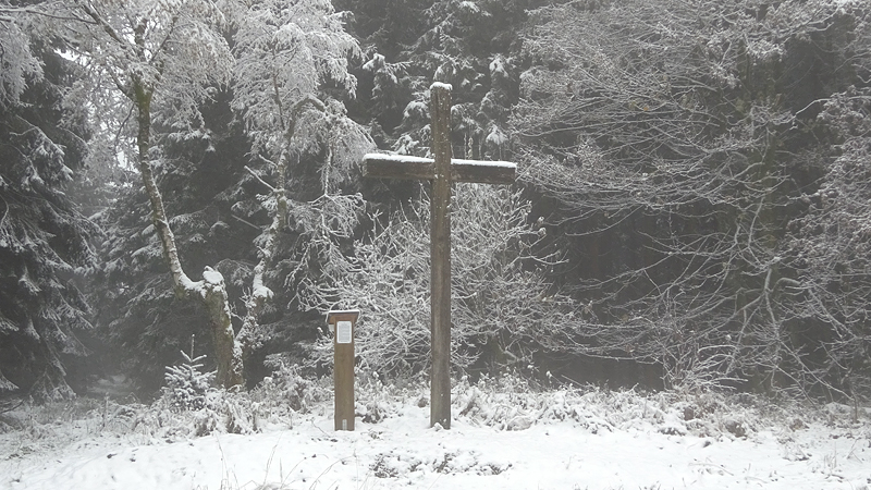 We kijken af en toe op de bordjes onderweg en daar staat ook de hoogte op. We zijn nu rond de 650 meter, dus 100 meter lager dan op de Bollerberg waar we gisteren zoveel plezier hadden met de sneeuw. Daar zal nu wel helemaal veel sneeuw zijn! We zien ook Winterberg staan en zien dat het maar 5 km is vanaf het punt waar wij weer omkeren. Maar we besluiten dat niet te doen. Dat is wel een erg groot extra lusje dan! We lopen even verder naar het Franzosenkreuz am Alten Weg en even later zijn we bij de splitsing waar wij rechtsaf slaan weer terug naar Hesborn.