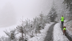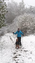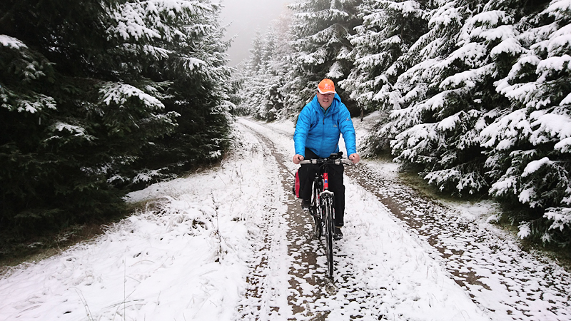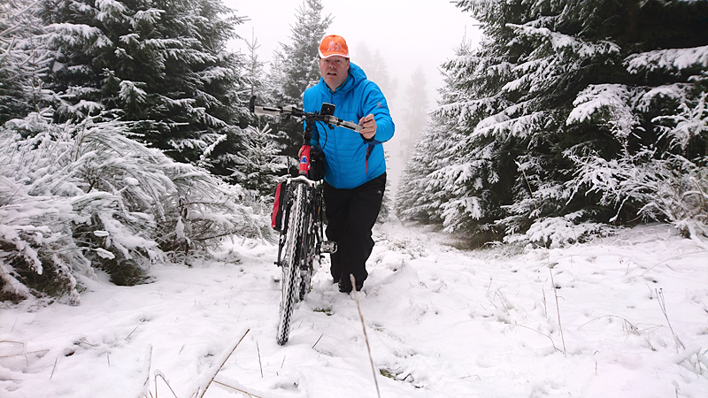 Het pad daarna is weer wat breder en beter toegankelijk maar we merken duidelijk dat we al een stuk hoger zijn dan bij de start. Er ligt veel sneeuw op de bomen en het is erg fraai. Het klimmen valt niet helemaal mee maar ik loop redelijk makkelijk naar boven en ook S. komt boven met zijn fietsje.
