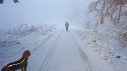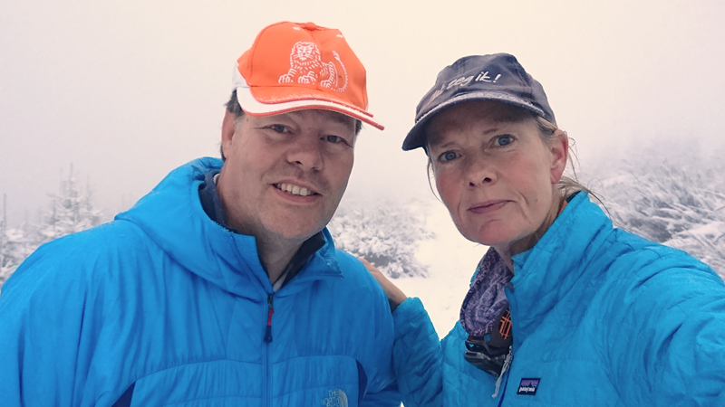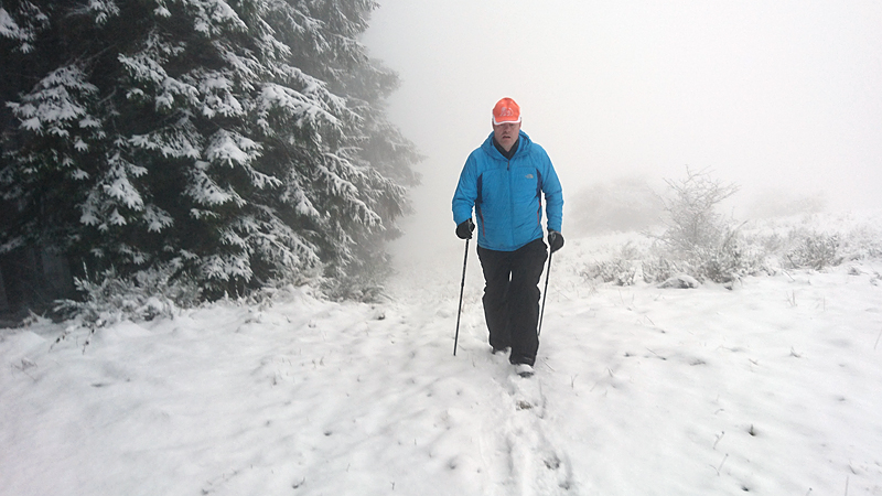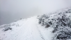 Het is zo mistig dat we de toren helemaal niet kunnen zien bij onze klim maar ineens zijn we op de top. We zien helemaal niets qua uitzicht maar de hoeveelheid sneeuw en de stilte maakt het prachtig. We blijven even staan luisteren naar de stilte en lopen daarna het pad weer naar beneden vanaf de toren.