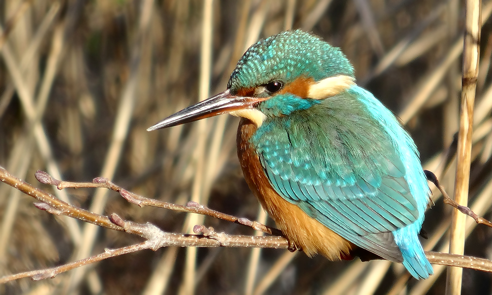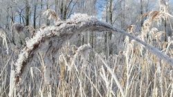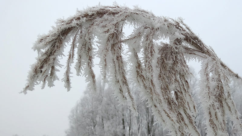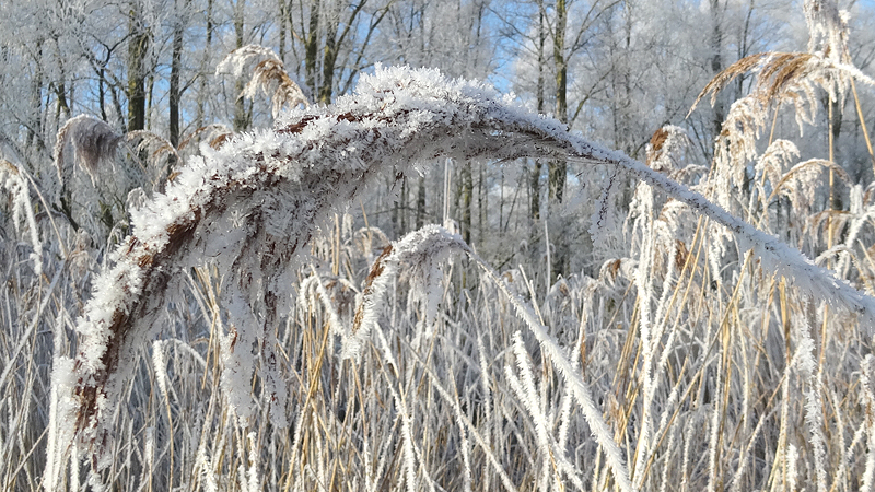 Ik loop weer het bekende stukje over het pad en geniet van de rijp op de rietpluimen en van de opkomende zon.