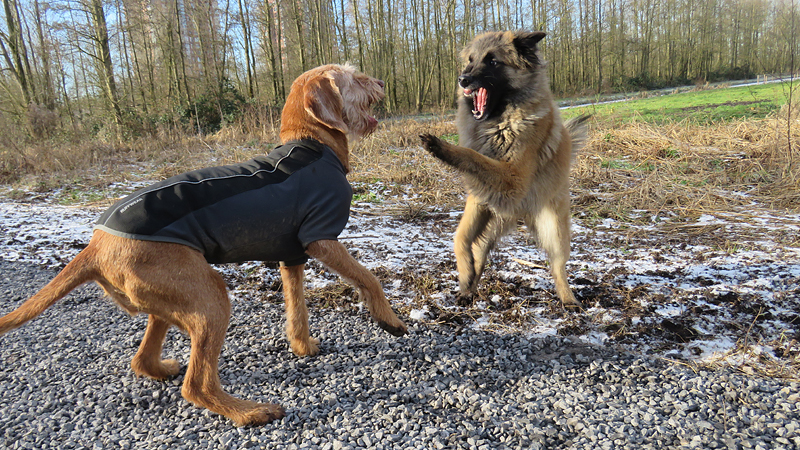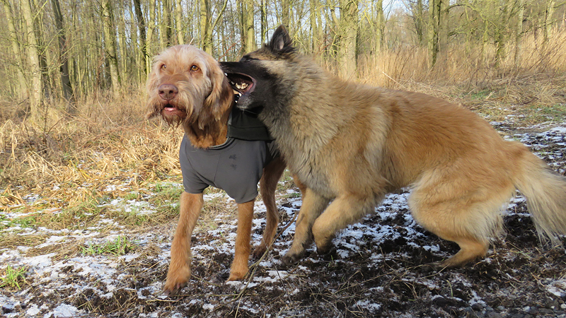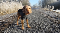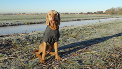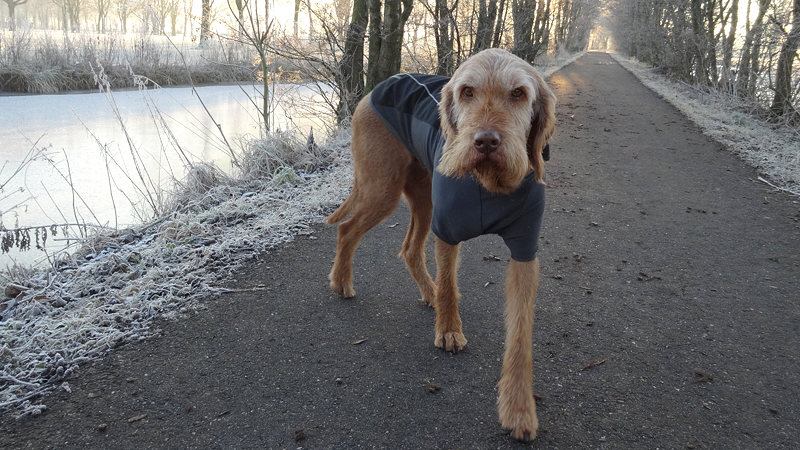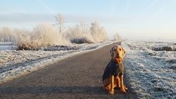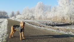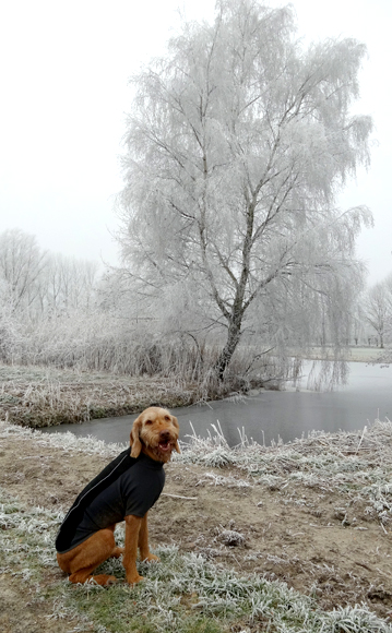 Ik kijk tevreden om me heen naar al het moois tijdens het lopen. Wafje doet het ook prima. Links van me zijn witte bomen met rijp, rechts van me komt de zon op. Een prachtige dag dus! Eigenlijk weer een dag om heel lang te lopen maar ja, wat is nou wijsheid? Ik merk nergens wat van en ook woefje lijkt het geen bal uit te maken of we nou 15 of 20 km lopen. Voorlopig loop ik dus maar even lekker door.