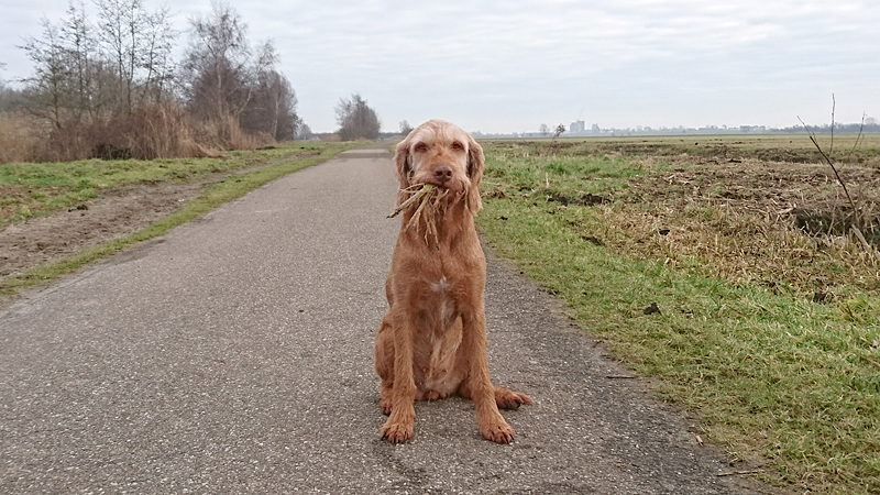 Gisteren liep ik maar een kort stukje dat nog lastig was vanwege de pekel op het pad. Ik koos toen voor onverharde stukken waar woef geen last van zou hebben. Vandaag gaan we naar Garderen om te lopen. Vanmiddag hebben we een afspraak met een makelaar maar we kunnen nog wel even snel op pad voor een rondje. Er ligt een dun laagje sneeuw en dat is wel mooi om te zien! Tijdens ons loopje blijft het een beetje motsneeuwen maar we hebben er geen last van. Wafje vindt alles leuk! Eerst eens even voelen of het glad is en daarna gaan we op pad.