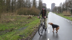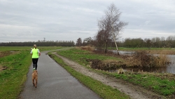 Vandaag gaan we in de ochtend weer op pad voor een rondje. Het regent bij de start maar gelukkig is dat maar van korte duur. Maar vanwege de regen (en dus de natte weg), rijdt S. vandaag niet op zijn nieuwe Cube fietsje maar op de Koga). We doen eerst de warming up via het grindpaadje en daarna starten we onze run. Het is tamelijk rustig vandaag dus dat is wel prettig op zich. Er staat nog steeds veel wind maar toch is de temperatuur vandaag vrij hoog en voelt alles erg warm. Ik heb al snel mijn sleeves uit en ook mijn buff verdwijnt al snel in een zak. Vervelend weer om je goed op te kleden want als je te warm gekleed bent, koel je razendsnel af door de harde wind. Niet echt prettig.