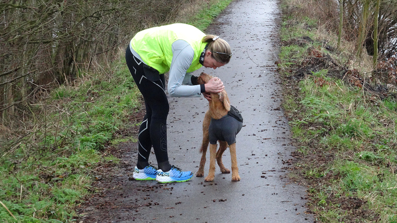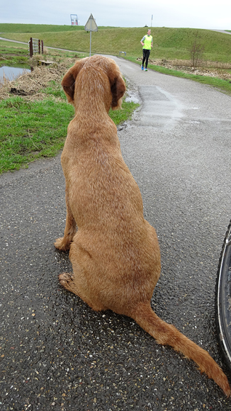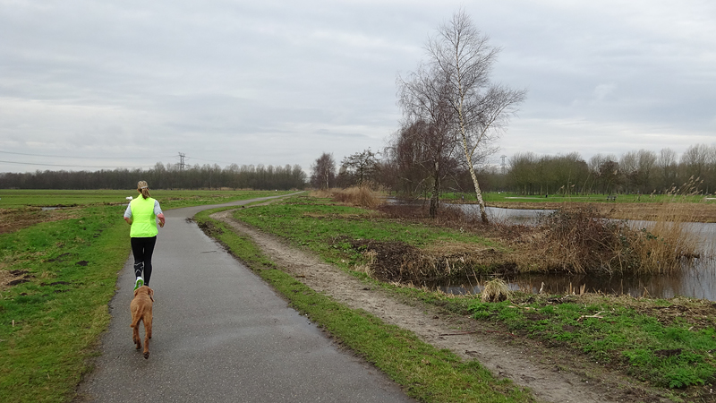Ik start met 500-tjes en loop daarna het middenstuk van 2.500 meter. De hartslag blijft daarbij mooi laag maar ik vind die 2.500 meter wel even genoeg met die harde wind. Daarna hobbelen we rustig weer terug naar de auto en met 11 kilometer staan we weer bij de start. Genoeg voor vandaag! Vanmiddag gaan we nog een stukje fietsen!