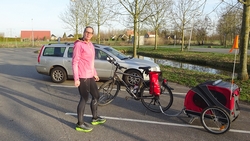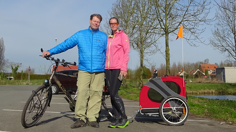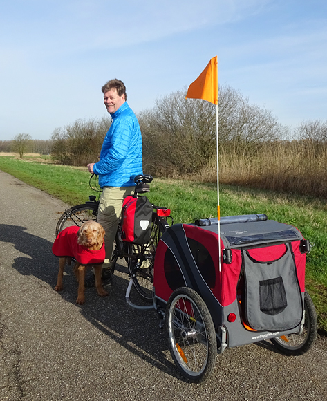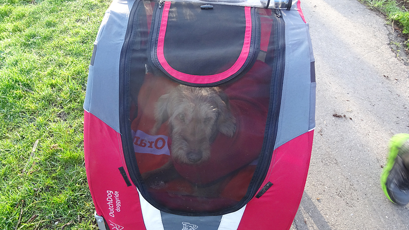 Het is echt prachtig weer maar nog best fris in de ochtend. Maar een heel verschil met vorige week. Waf heeft in de kar een jas aan zodat ze niet stijf wordt van het liggen. In het zonnetje natuurlijk bloot. Op onderstaande foto wilde ik haar net in de kar proppen. Vandaar het jasje.