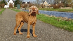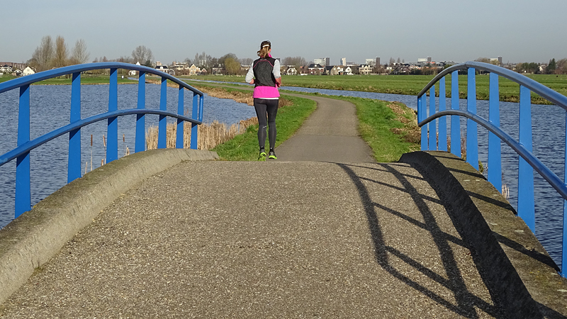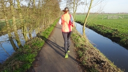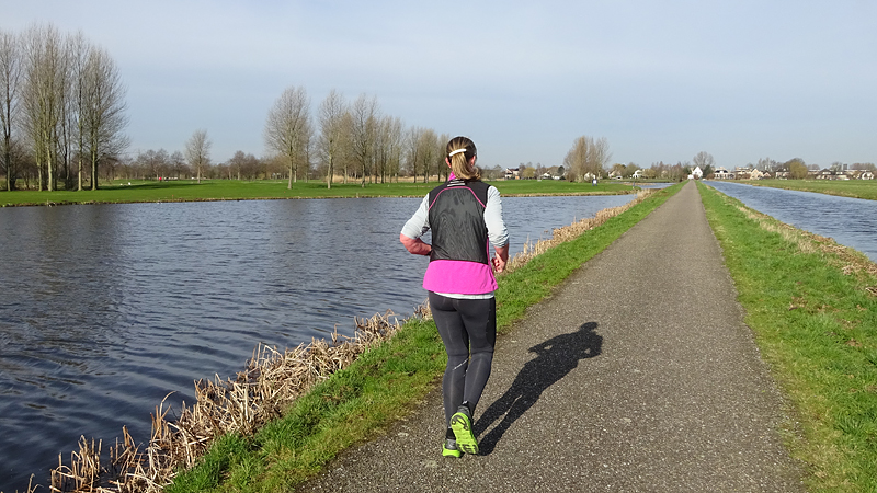 Vandaag is het prachtig weer en we besluiten op pad te gaan met de doggyride zodat wafje elke keer even een stuk kan wandelen of draven. Ik ga 2000-tjes lopen en na elke 2000 meter wandelt ze een flink stuk mee. Dat gaat gelukkig prima. Ze loopt goed en ze is blij en kijkt ook happy.