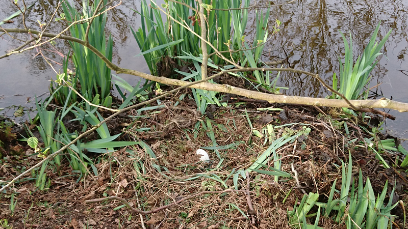 We komen precies uit aan het einde van de route en daar maak ik nog even een fotootje van woef. Het zonnetje is even door de wolken gekomen dus dat is ook lekker. Als ik de cool down heb gedaan en naar de auto terug wil lopen over de parkeerplaats (om de zwanen te vermijden), zie ik dat de dieren aan het zwemmen zijn. Dan kan ik wel even langs het nest lopen over het fietspad en snel een kiekje maken van het ene ei in het nest. Leuk straks jonge zwaantjes!